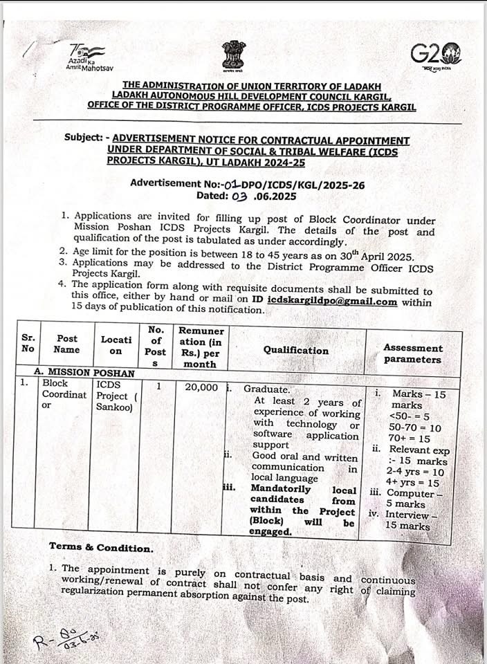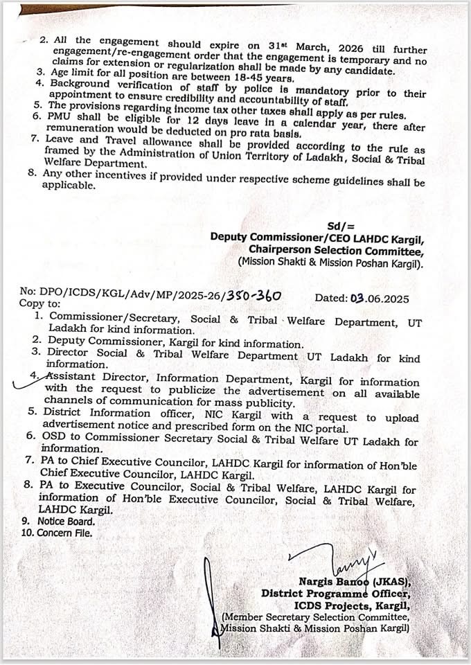 Politics Advertisement notice for contractual appointment under Department of Social & Tribal Welfare (ICDS Projects Kargil), UT Ladakh 2024-25. editor June 3, 2025 Continue ReadingPrevious: Merit list of full time teachers for KGBV under Samagra.Next: CEO Kargil Issues Recruitment Notification for Netaji Hostels Across Four Zones in District Kargil Related Stories Politics Merit list of full time teachers for KGBV under Samagra. editor June 3, 2025 Politics HRECF Leh has issued the Final selection list of the candidates for the Junior Engineer (Civil) post in PWD Department, UT-Ladakh for the FY 2025-26. editor May 29, 2025 Politics Ladakh’s Next 7 Days: What You Need to Know About Rain, Snow & Chill – Click to Read! editor May 12, 2025